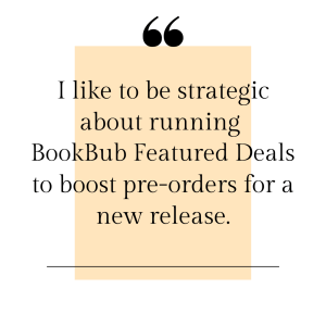 I also try to do a BookBub Featured Deal every three months or so, which helps give a bump to everything, especially in a series with new releases. I like to be strategic about running those to boost pre-orders for a new release. When possible, I use a Kindle Countdown Deal to discount the book for the ad, as that gives a higher royalty rate than just lowering the list price. The downside is that the KCD can only be done in the US and UK currently.